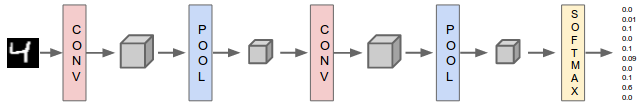 Here's an MNIST digits example: suppose we have an image (a 28x28 array of pixel values) that contains a 4. We create a 2D volume of size (28,28) and fill it with the pixel values. Then we pipe the input volume through the network and get output volume of 10 numbers representing the probability that the input is any one of 10 different digits: